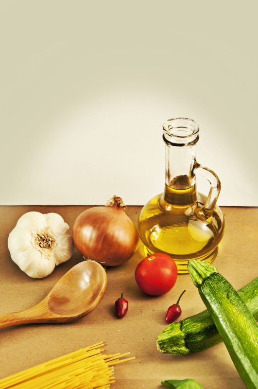 Die genuinen Zutaten der gesunden, mediterranen Küche: Olivenöl, Knoblauch, Zwiebeln, frisches Gemüse, Sardinien – meer sardinien urlaub